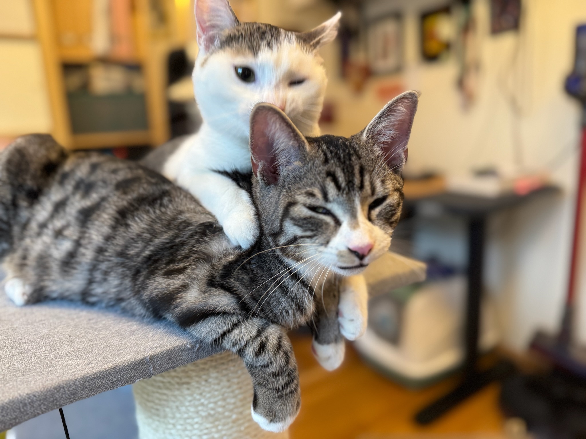 tal vez todavía nos recuerdes. Contigo nos llamábamos Leni y Momo, pero ahora nos llamamos Nele y Smilla :) En febrero de 2023 fuimos adoptados por nuestros compañeros de cuarto humanos y hemos estado viviendo nuestras mejores vidas desde entonces.