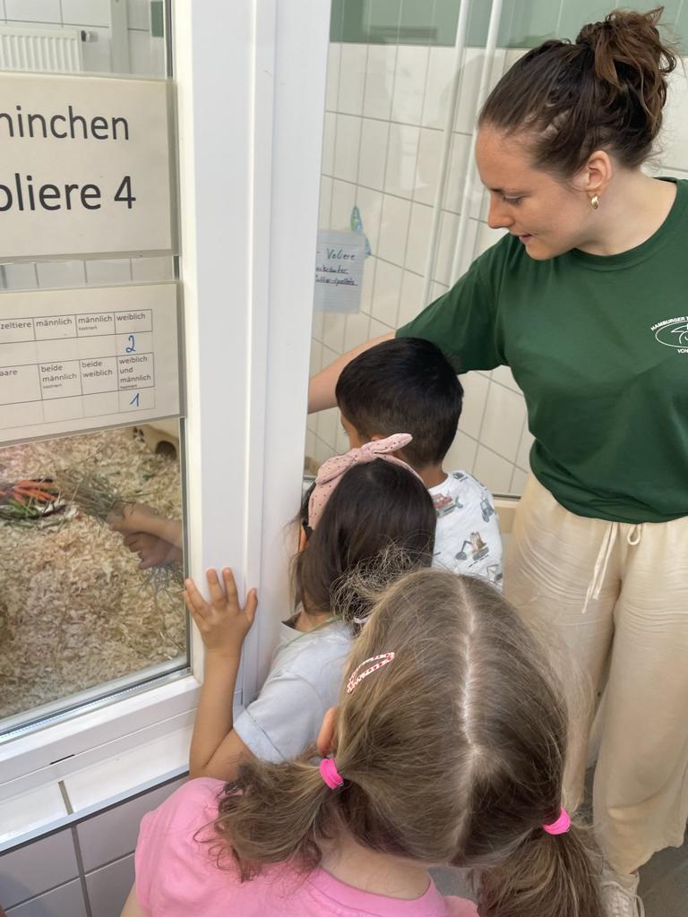 Luego fuimos a las distintas casas de animales de nuestras instalaciones: los niños pudieron observar a nuestros protegidos animales y comprobar cómo se alojan con nosotros. Los niños se dividieron en grupos de expertos: gato, periquito y pez. ¡Por supuesto, cada grupo tuvo que observar de cerca a su animal y su recinto! Después del recorrido, los niños registraron creativamente sus pensamientos sobre cómo mantener el animal de su grupo en un mapa mental o en un dibujo. Un cuestionario proporcionó una conclusión emocionante: los propios niños respondieron correctamente al final a la difícil pregunta profesional como una bala.